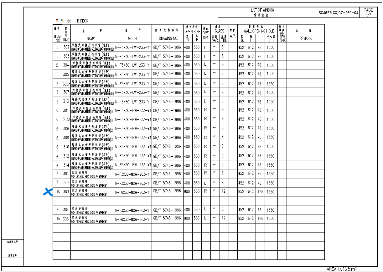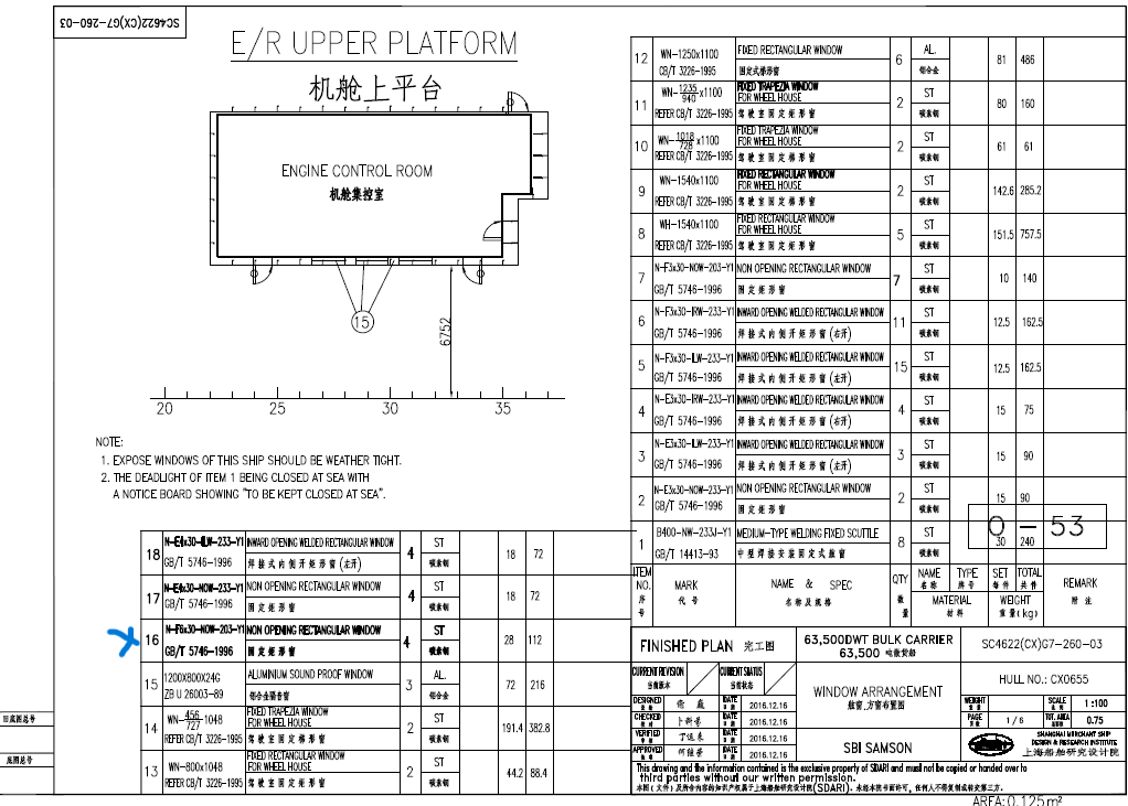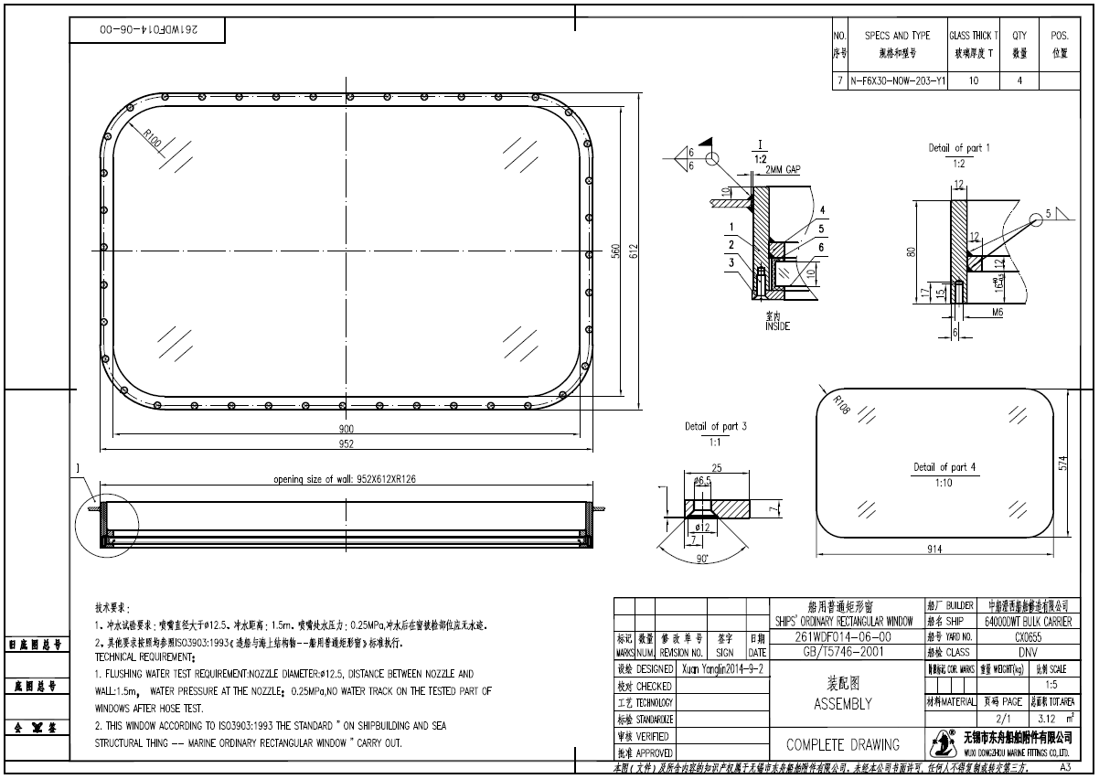 Cabin rectagular window glass, Model no. N-F6X30-NOW-203-Y1, Drawing no. GB/T 5746-1996,Open size B-900mm, H-560mm, OPE.DIR.-IR, Glass VAR.-Y1, THI.-12, Wall opening hole: B-952mm, H-612mm, r-126, C.H.-1550.