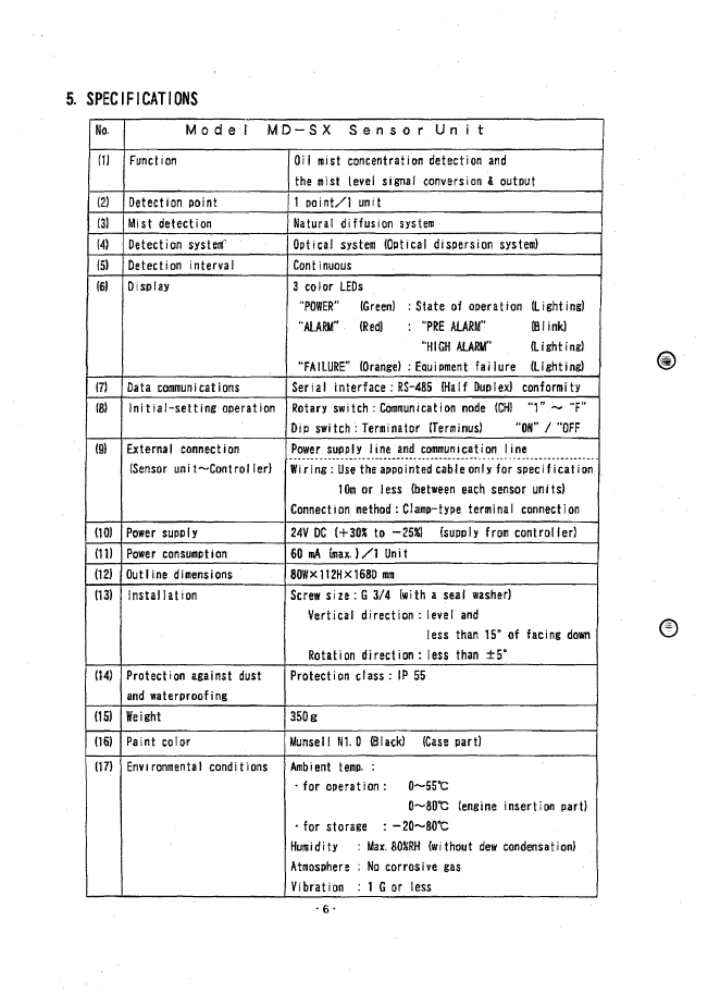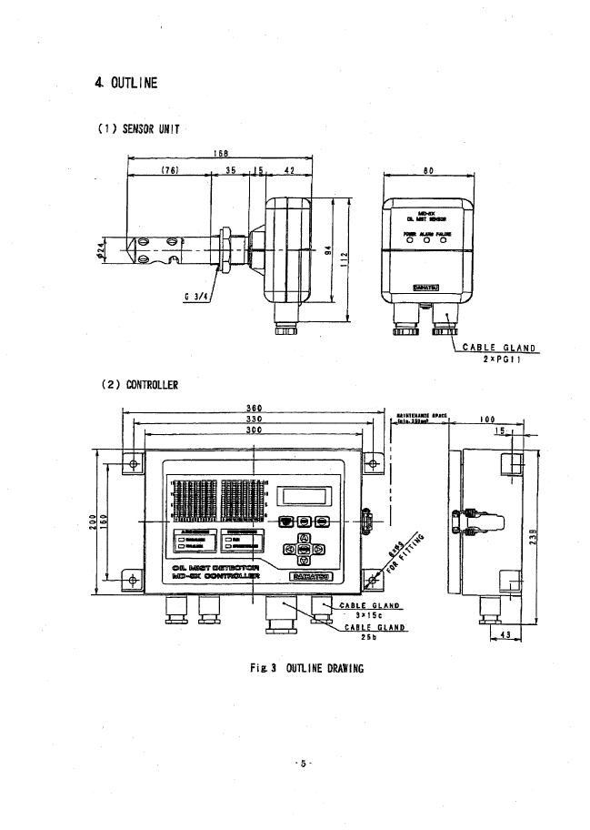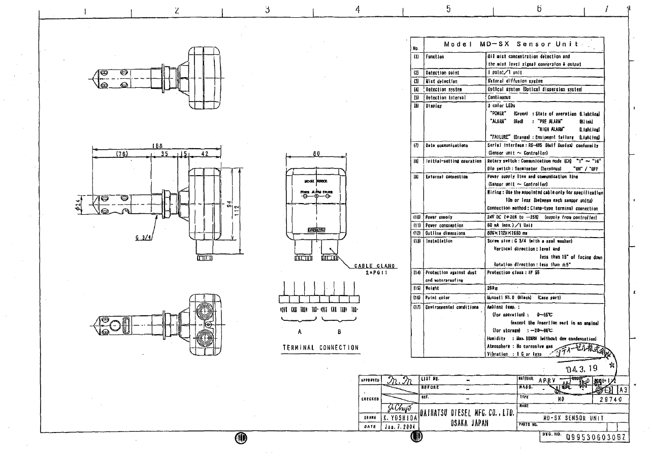 MD-SX SENSOR UNIT (POWER:DC24V, 60mA, MAKER:DAIHATSU DIESEL MFG, DETECTION SYSTEM:OPTICAL SYSTEM(OPTICAL DISPERSION SYSTEM), DISPLAY:3 COLOUR LEDS(POWER, ALARM, FAILURE), FUNCTION:OIL MIST CONCENTRATION DETECTION AND THE MIST LEVEL SIGNAL CONVERSION and OUTPUT, DETECTION INTERVAL:CONTINUOUS, DATA COMMUNICATION:SERIAL INTERFACE RS-485(HALF DUPLEX) CONFIRMITY, SENSOR UNIT - CONTROLLER, CABLE GLAND:2*PG11, OUTLINE DIMENSION:80W*112H*1680L.