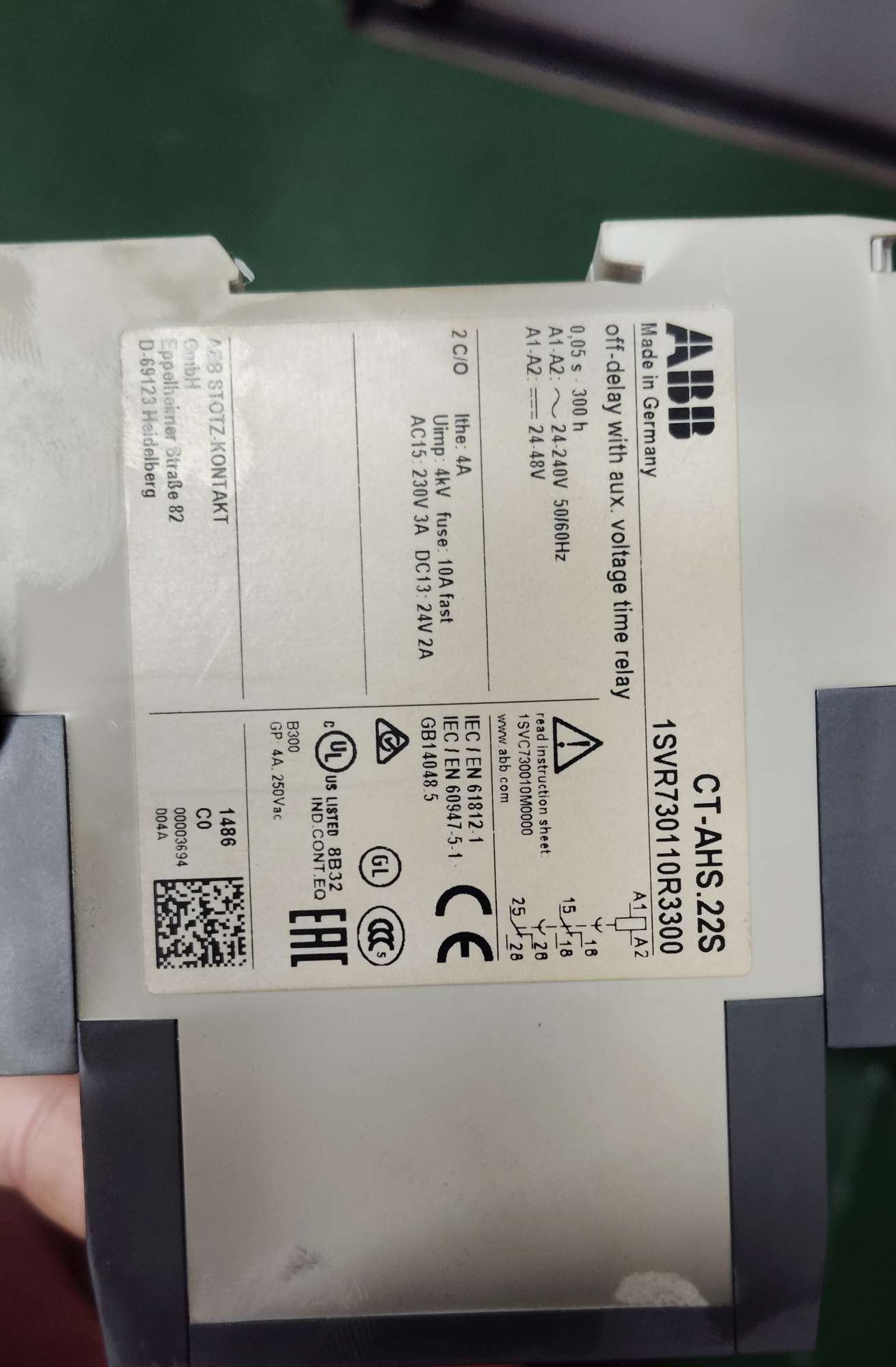 OFF DELAY WITH AUX.VOLTAGE TIME RELAYMAKER-ABBTYPE- CT-AHS.22S1SVR730110R33000.05s: 300hA1.A2~24-240V 50/60HzA1.A2 == 24-48V