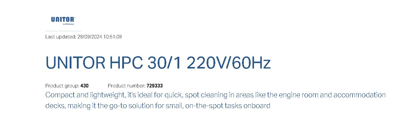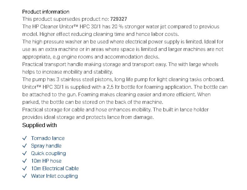 UNITOR HIGH PRESSURE WASHING MACHINEHPC 30/1 220 V / 60 HZTORNADO LANCESPRAY HANDLE50 Mtrs HP HOSE50 Mtrs ELECTRICAL CABLEWATER INLET COUPLING