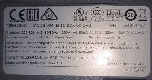 SOFT-STARTER,MAKER:DANFOSSMODEL:MCD6-0244B-T5-S2X-00-CV2,CURRENT RATING:250A,AC:53b:3-10:590,3-PHASE,200-525 VAC,50/60Hz,,132kW(180HP)400VAC,MOTOR OVER LOAD PROTECTION CLASS 10A