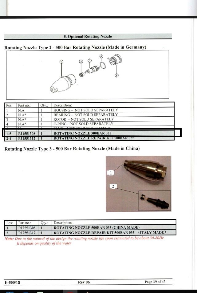 ROTATING NOZZLE FOR PRO-JET E500/18 HYDROBLASTER / PART NO: PJ1551308 / 500 BAR ROTATING NOZZLE