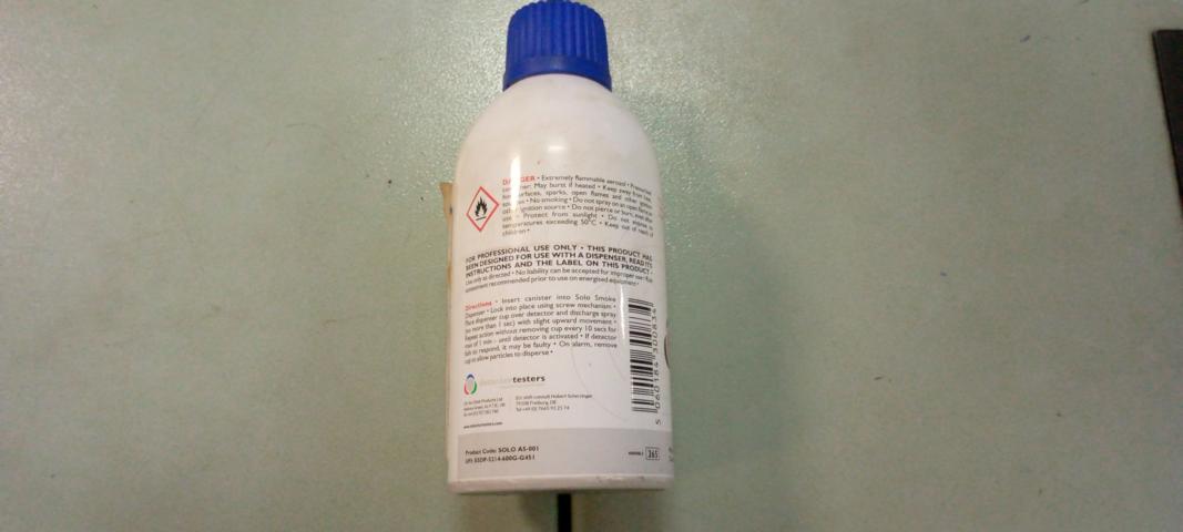 NAME: SMOKE DETECTOR TESTER TYPE: A5 MAKER: SOLO CONTENT: 250ml