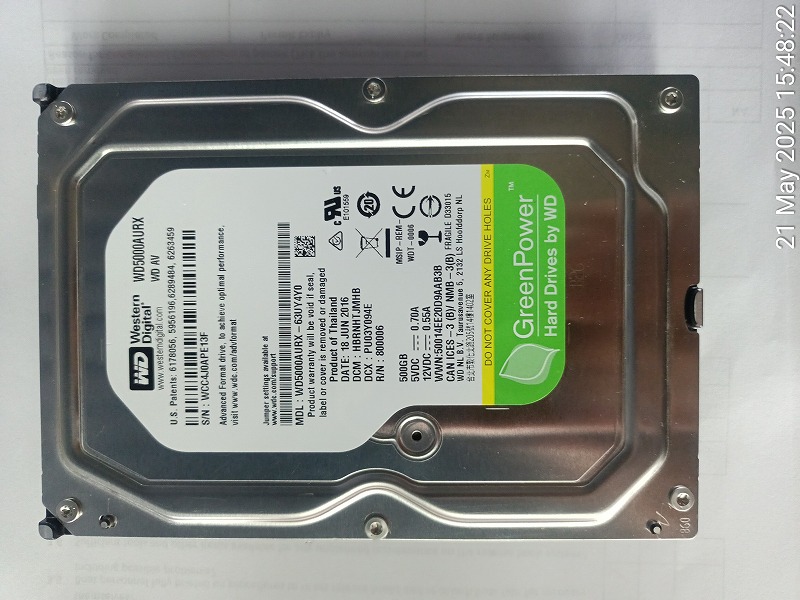 HDD MAKER: WESTERN DIGITAL, PART NO: WD5000 AURX-63UY4YO, REMARKS: SEE ATTACHED PHOTOS, ECDIS MAKER: JRC, MODEL: JAN-901B